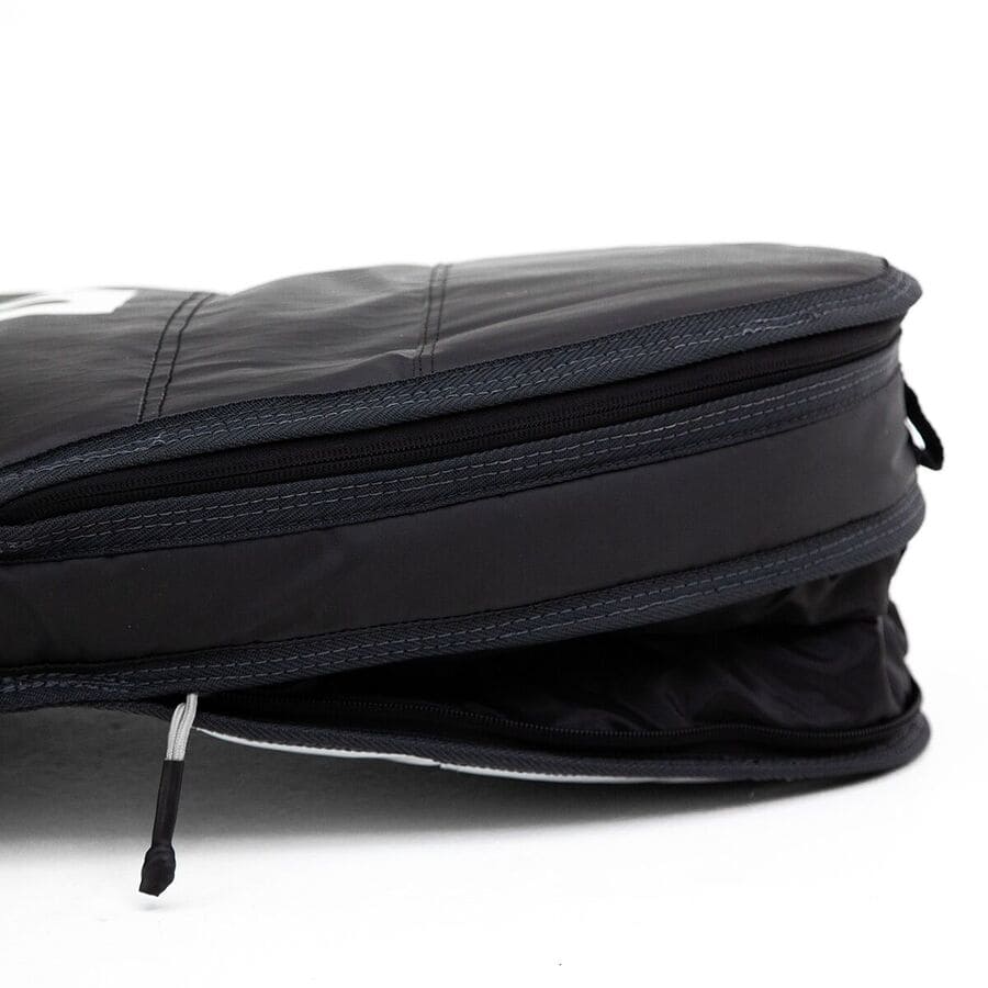 Suwaki są zabezpieczone od środka warstwą pianki, tak żeby uniknąć uszkodzeń na desce. Pokrowiec na rufie można rozpiąć - w ten sposób wsadzisz do środka deskę z zamontowanymi finami, chociaż nie polecamy w ten sposób nadawać jej na bagaż. Jest to dobra opcja na zwiększenie pojemności pokrowca na czas lotu, lub wykorzystanie go jako ochrona deski również podczas wyjazdu.
